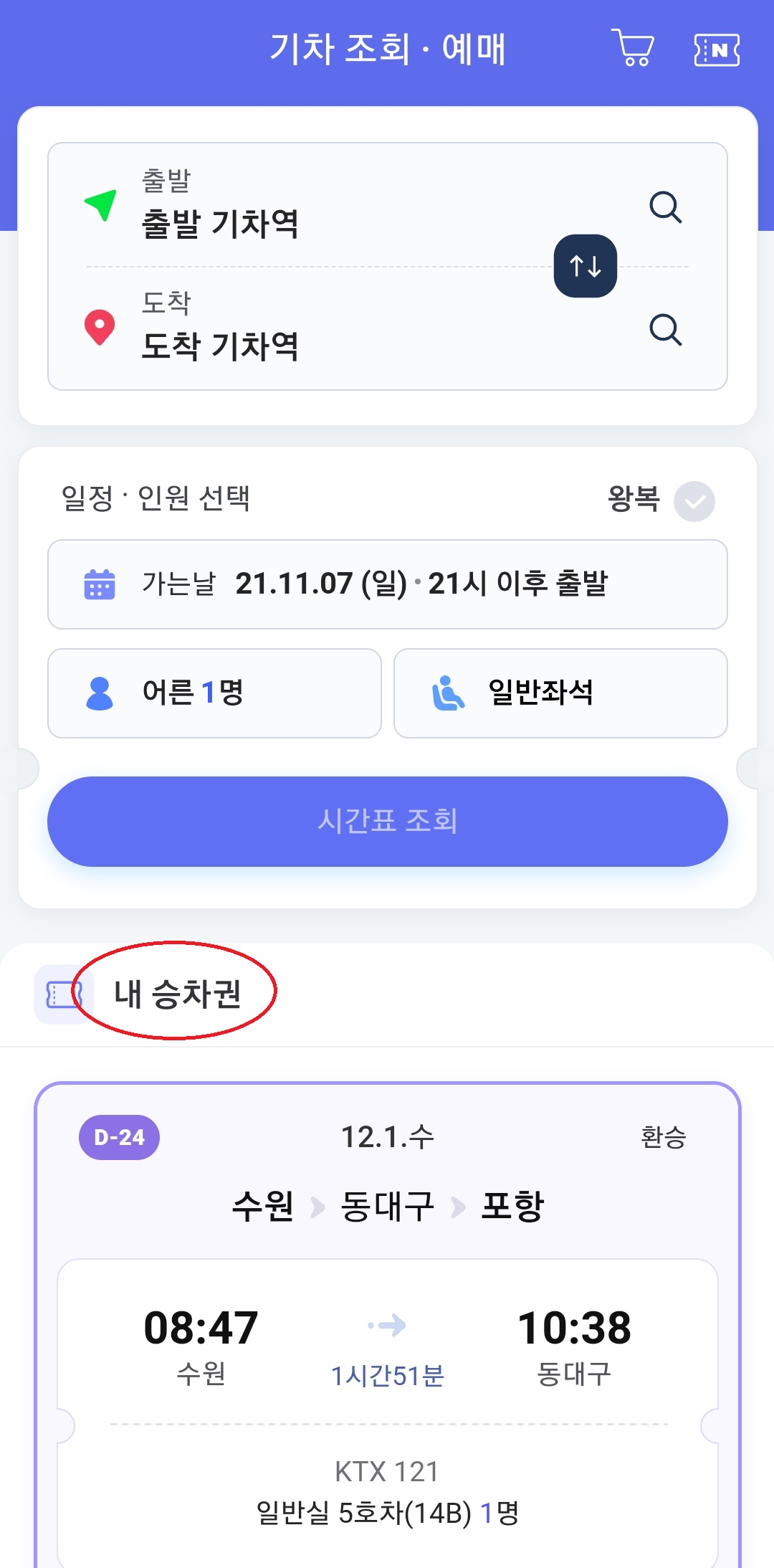 아래 내 승차권에 방금 예매한 승차권을 확인할 수 있습니다.