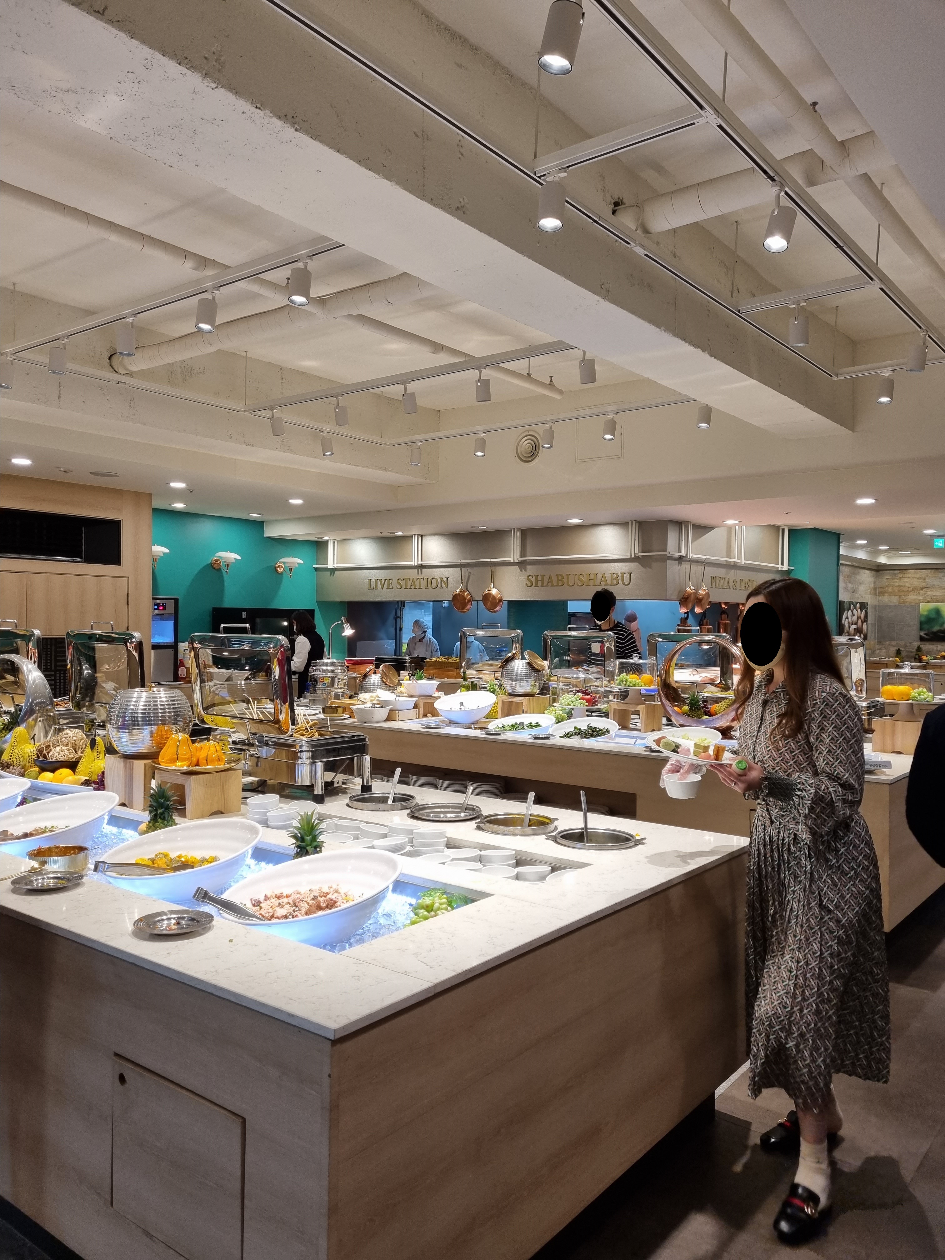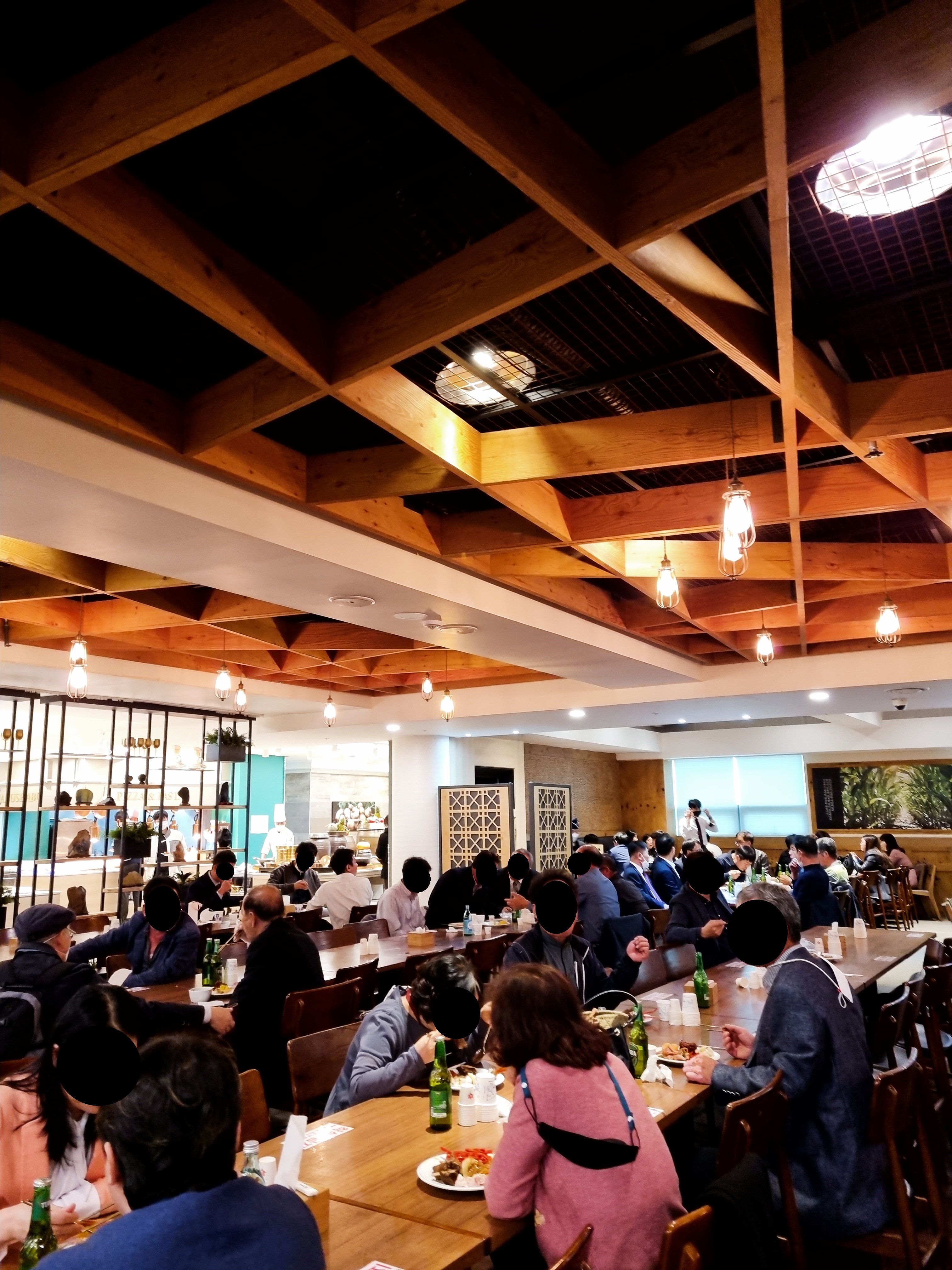 식사는 뷔페식이며 음식 종류도 다양하고 자리도 넉넉합니다.