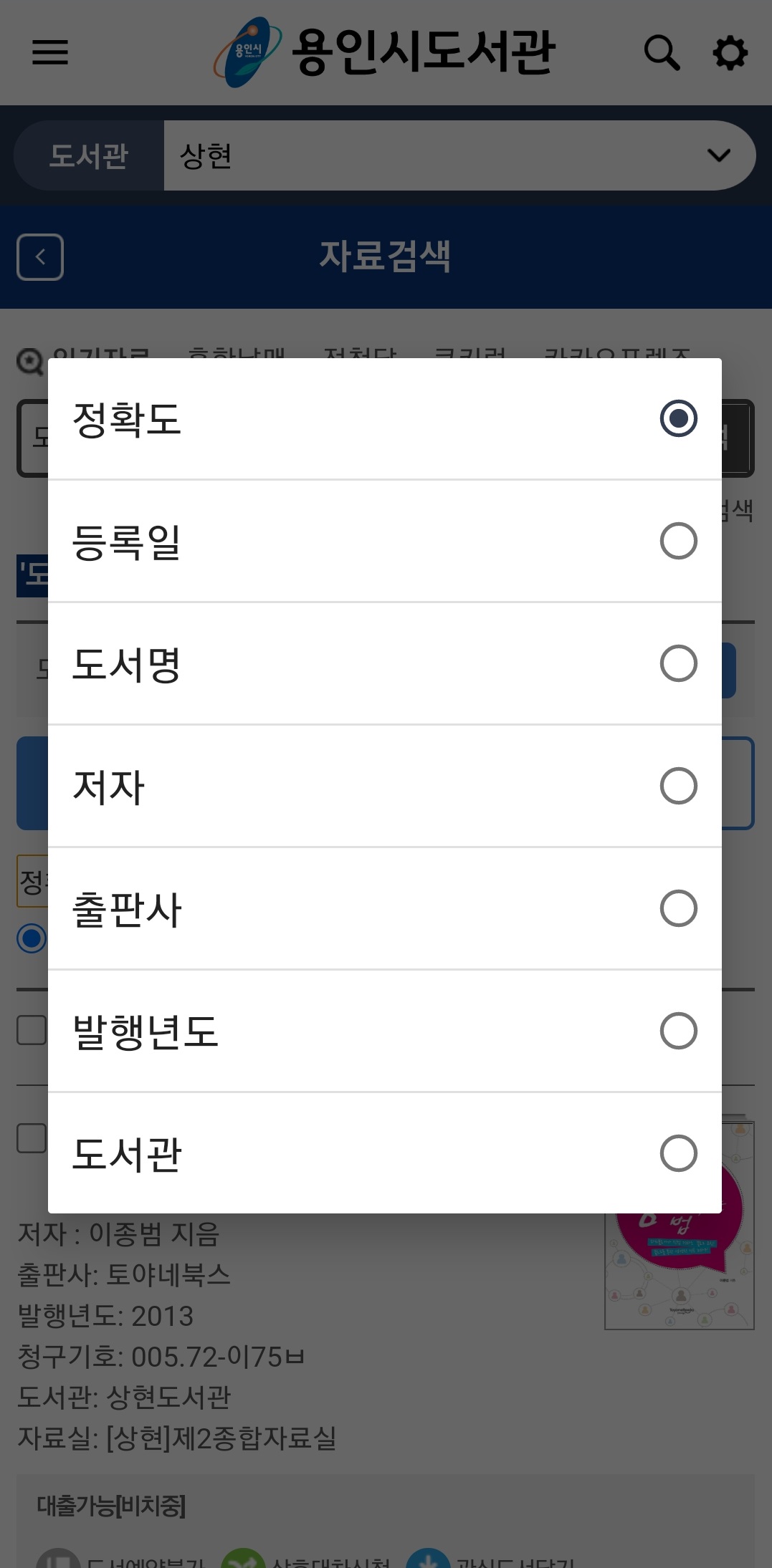 자료검색 후 일반도서, 어린이 도서 구분해서 보는 게 가능하고, 정확도 클릭하시면 오른쪽 사진같이 등록일, 도서명, 저자 등등 고르는 게 가능해요. 발행년 도로 검색하시면 가장 신간부터 검색이 가능합니다~