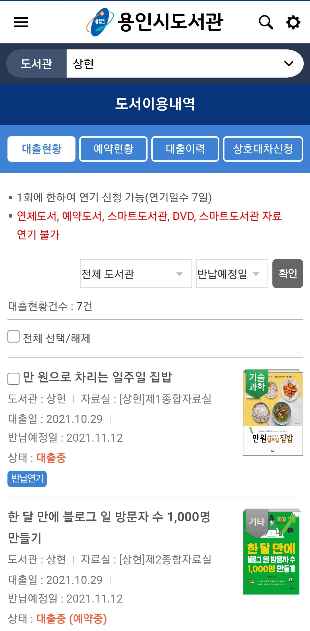 - 대출 현황은 제가 빌린 책의 반납예정일, 대출 상태를 알 수 있어요. 반납연기를 누르면 일주일 정도 반납예정일이 연장됩니다.(가장 애용하는 버튼..♥) 뒤에 예약한 사람이 있으면 반납 연기가 불가합니다~