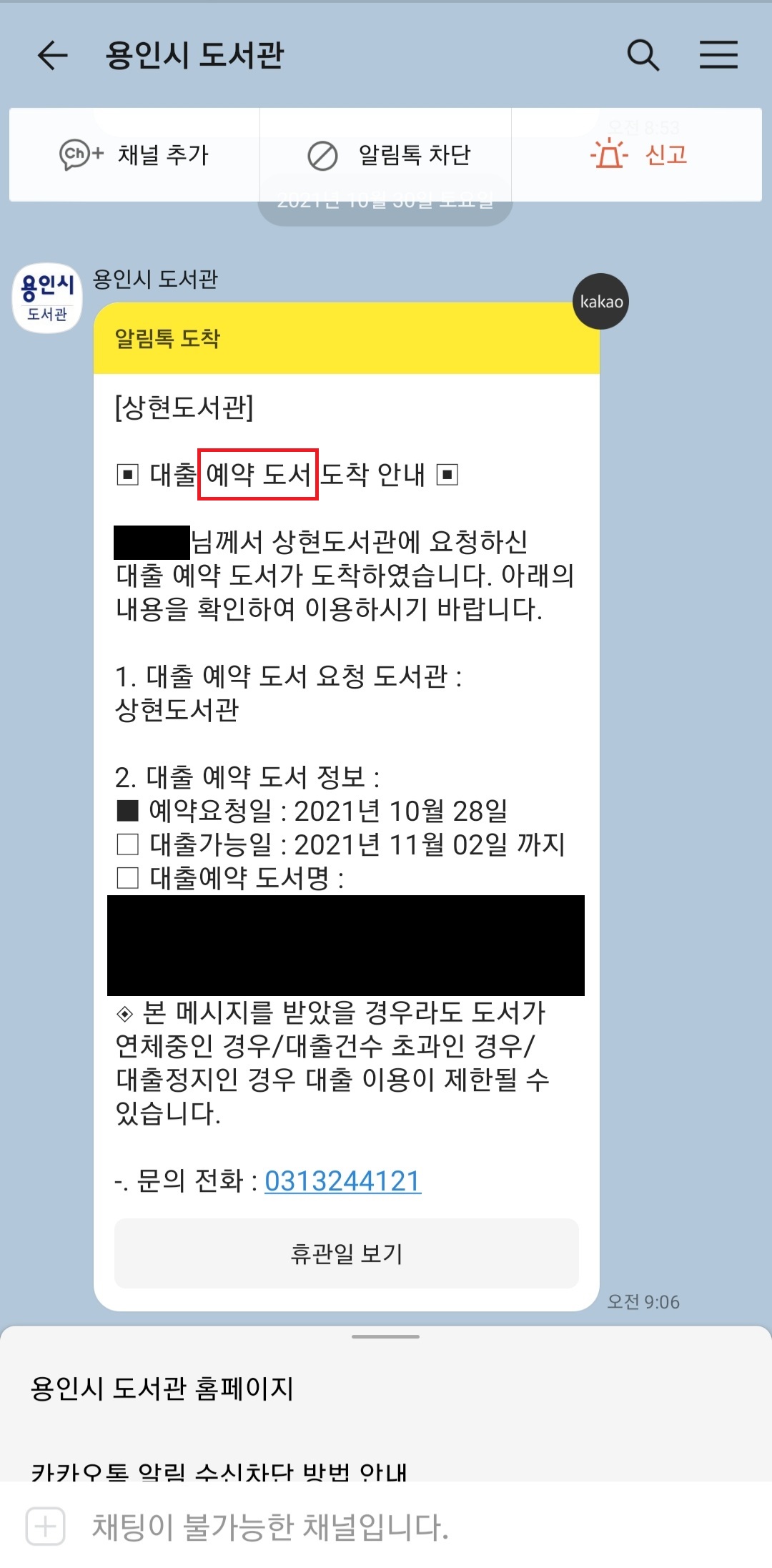 용인시 도서관 카카오톡 친구 추가하시면 상호대차, 반납예정일, 예약 도서 도착, 도서관 행사 등 알림이 오니