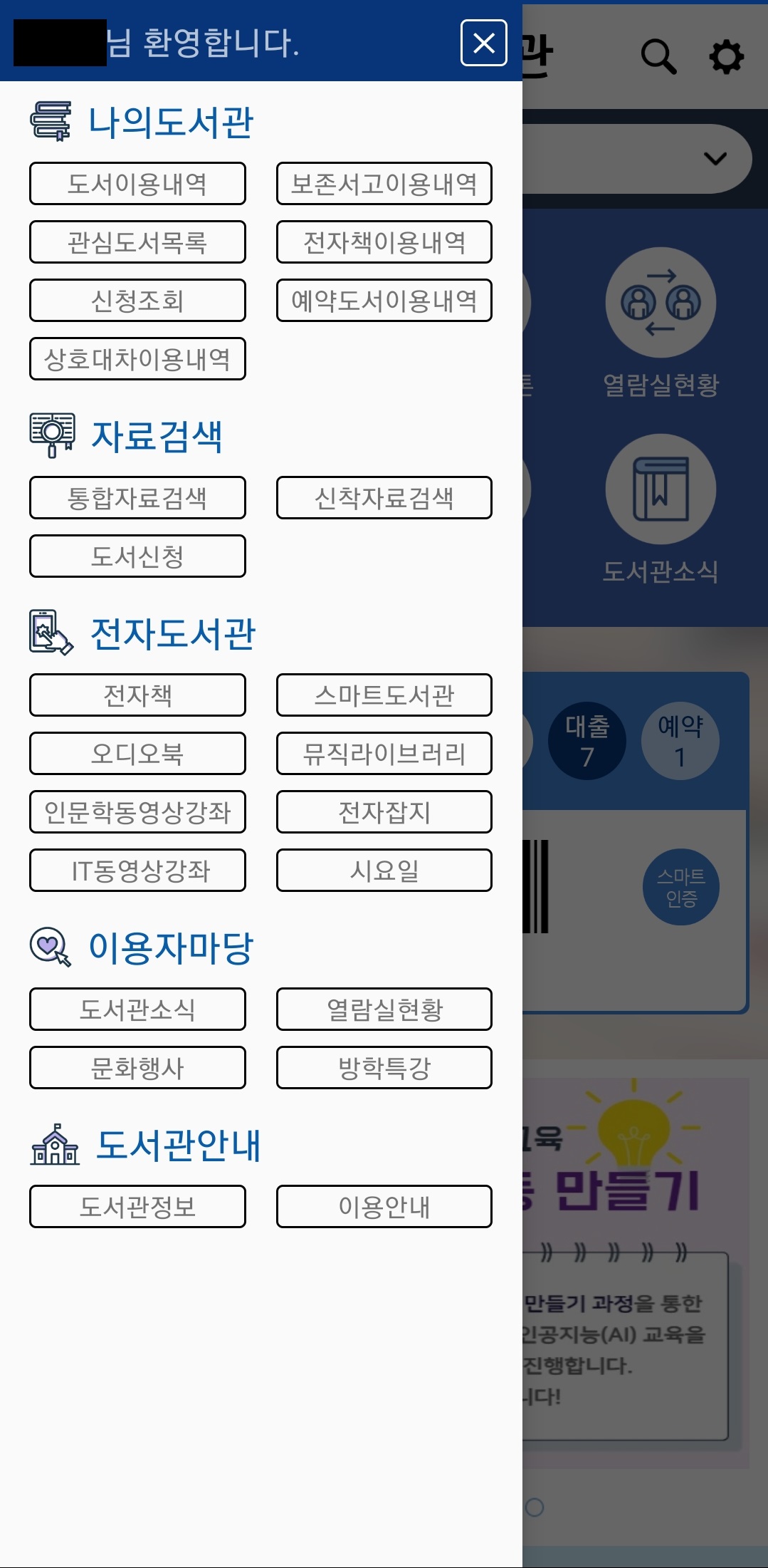 오른쪽 상단 메뉴를 누르면 내 서재 밑에 도서관 변경을 누르시면