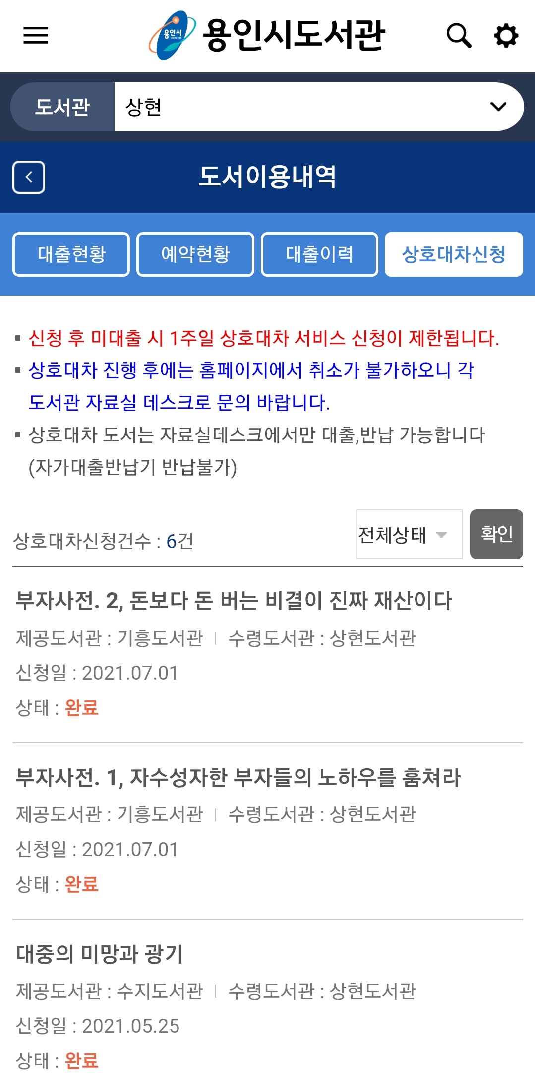 - 상호대차 신청은 내가 주로 가는 도서관에 그 도서가 없을 시 다른 도서관에서 내 도서관으로 책을 보내줍니다. 너무 좋은 기능이죠~ (내가 자주 가는 도서관에 도서가 없어야 가능해요. 누가 책을 빌려가 볼 수 없는데 다른 도서관에는 대출이 가능하다고 상호대차 신청한다고 그 책을 빌려볼 수 없습니다~)
