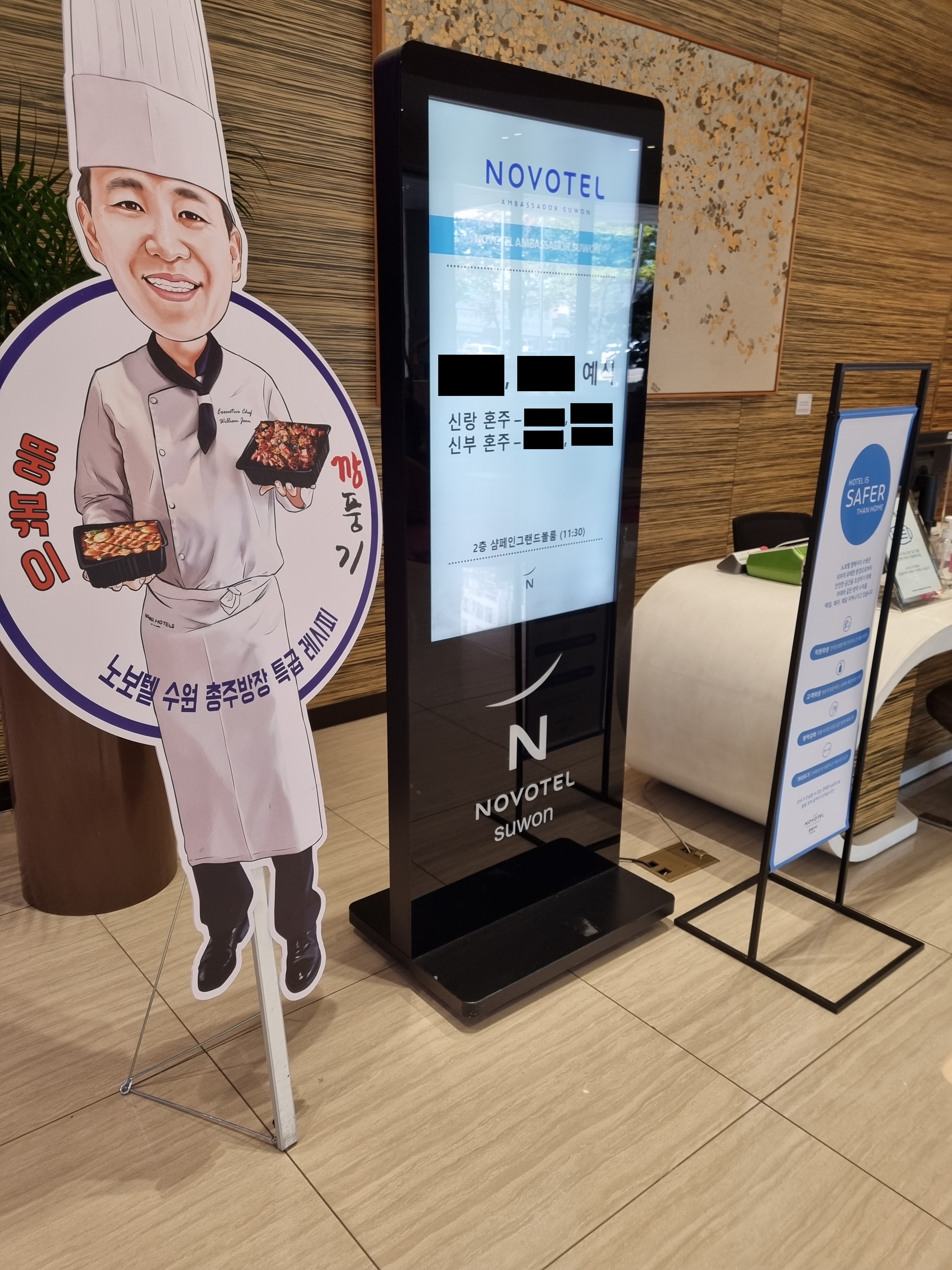 호텔 건물 정면으로 입장하시면 중앙 안내판처럼 예식 하는 신랑, 신부님 이름이 있고 밑에 층수와 장소가 나옵니다.