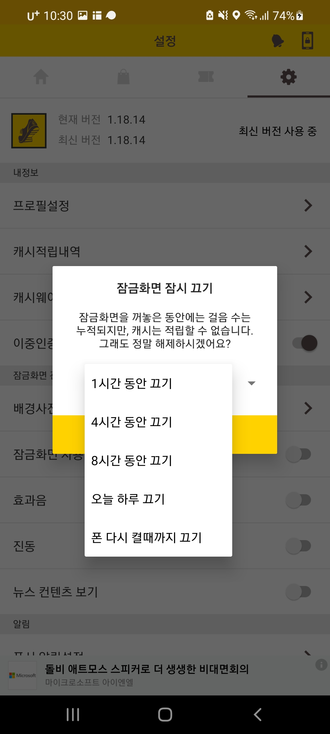 아래 '잠금화면 사용하기'를 활성화하면 만보기 기능이 켜져 걷는 수에 따라 캐시가 적립되고,