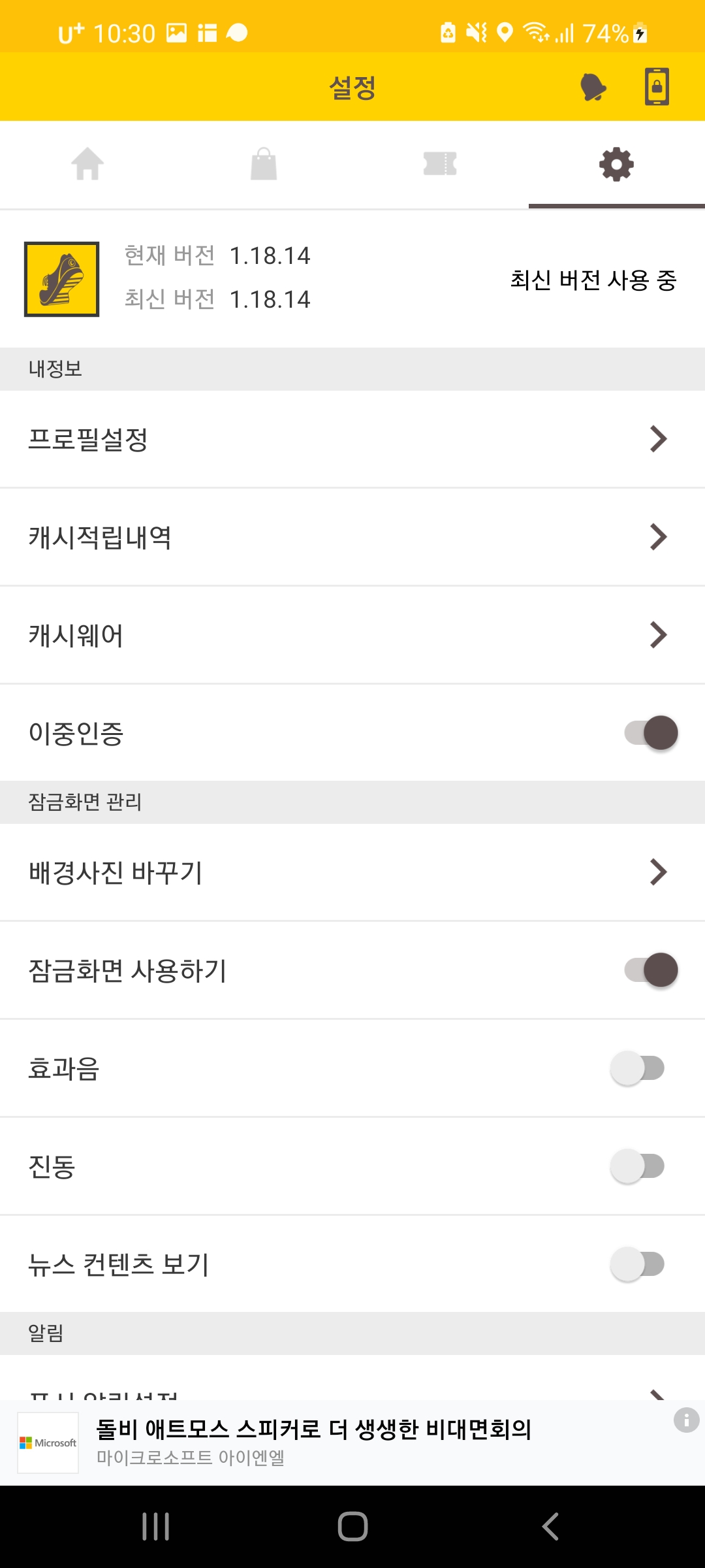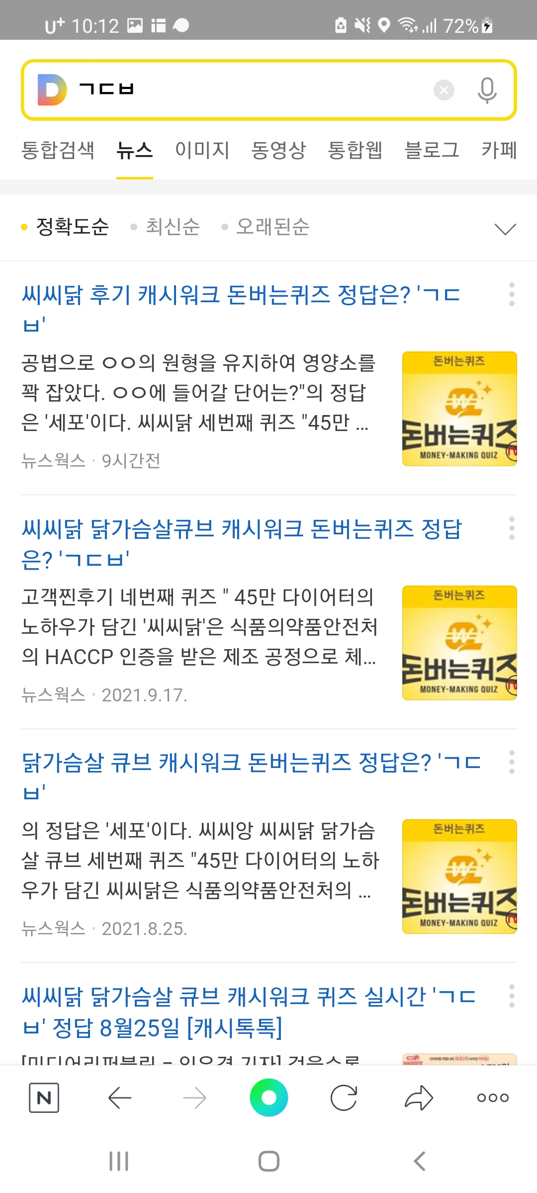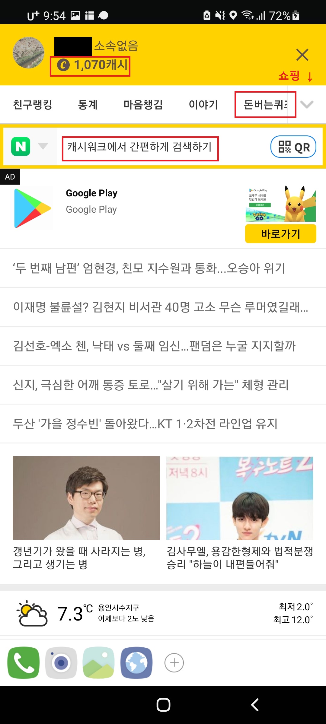 여기서는 캐시, 돈 버는 퀴즈, 검색창, 쇼핑, 뉴스만 보시면 됩니다.