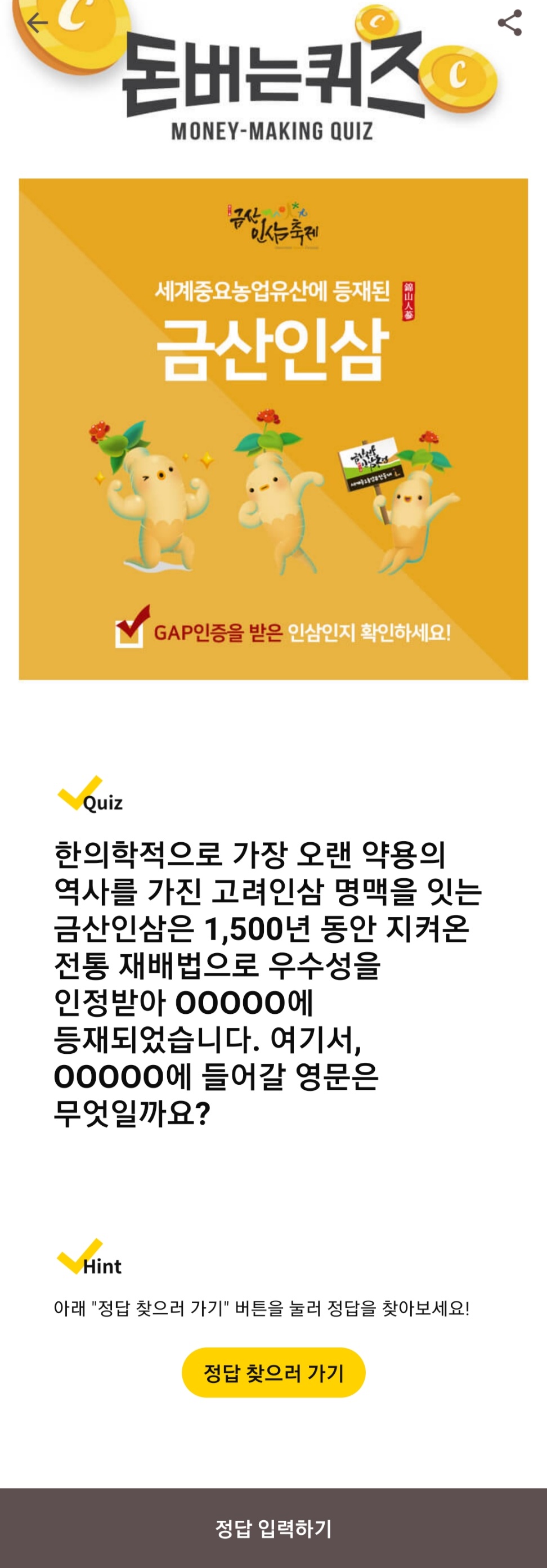 3. 퀴즈 정답을 찾고 아래 '정답 입력하기'에 답을 넣으시면 캐시를 랜덤으로 받습니다.
