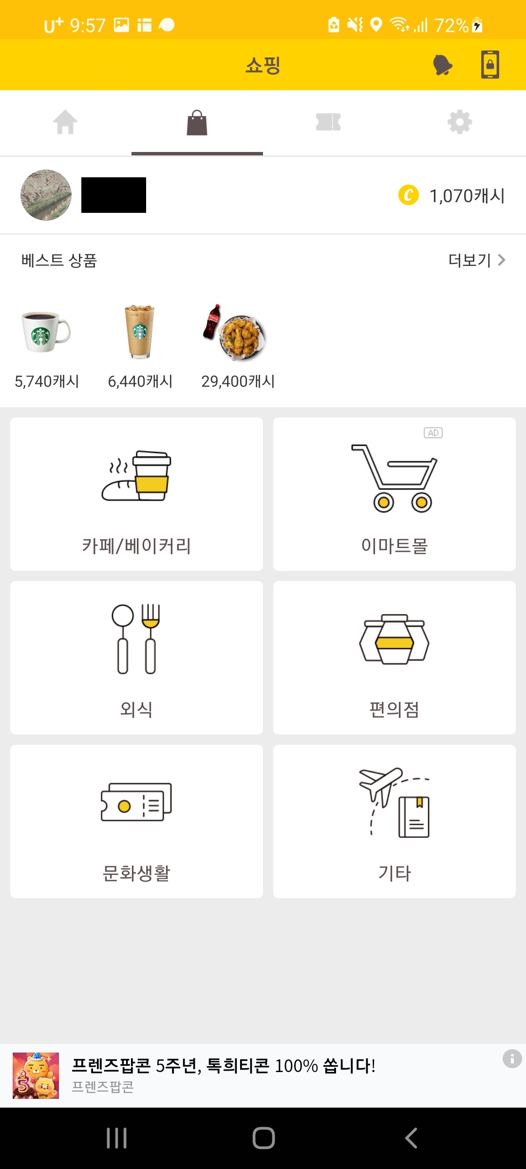 쇼핑 : 적립한 캐시를 물건으로 교환할 수 있는 곳입니다.