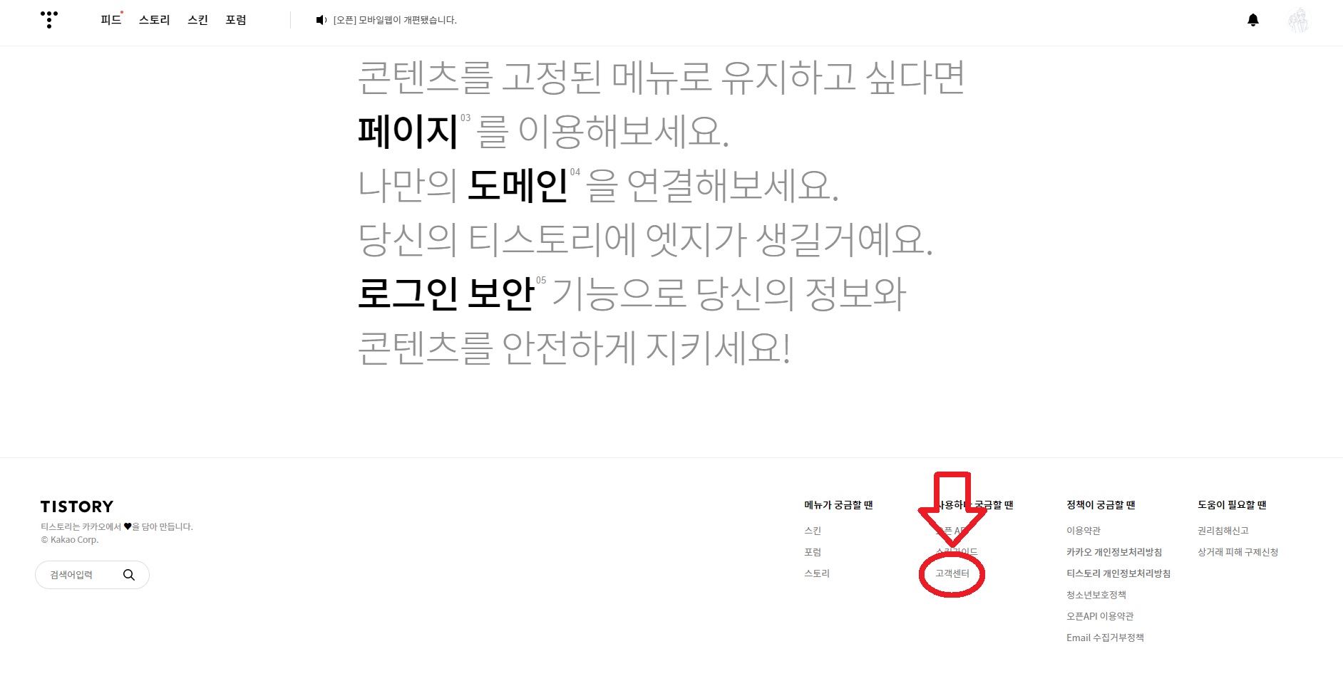 화면 아래로 이동하시면 하단에 고객센터가 있습니다.
