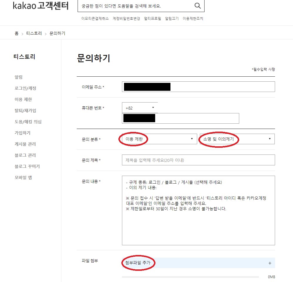 - 문의 분류 : 이용제한 - 소명 및 이의제기로 설정합니다.
