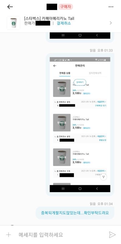 구매자가 위 사진을 보내면서 스타벅스는 어플로 사용 여부를 알 수 있다고 알려줬어요.