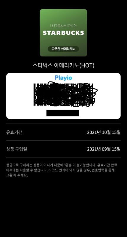 팔라고에 스타벅스 아메리카노(유효기간 2021년 10월 15일까지)를 팔았습니다.