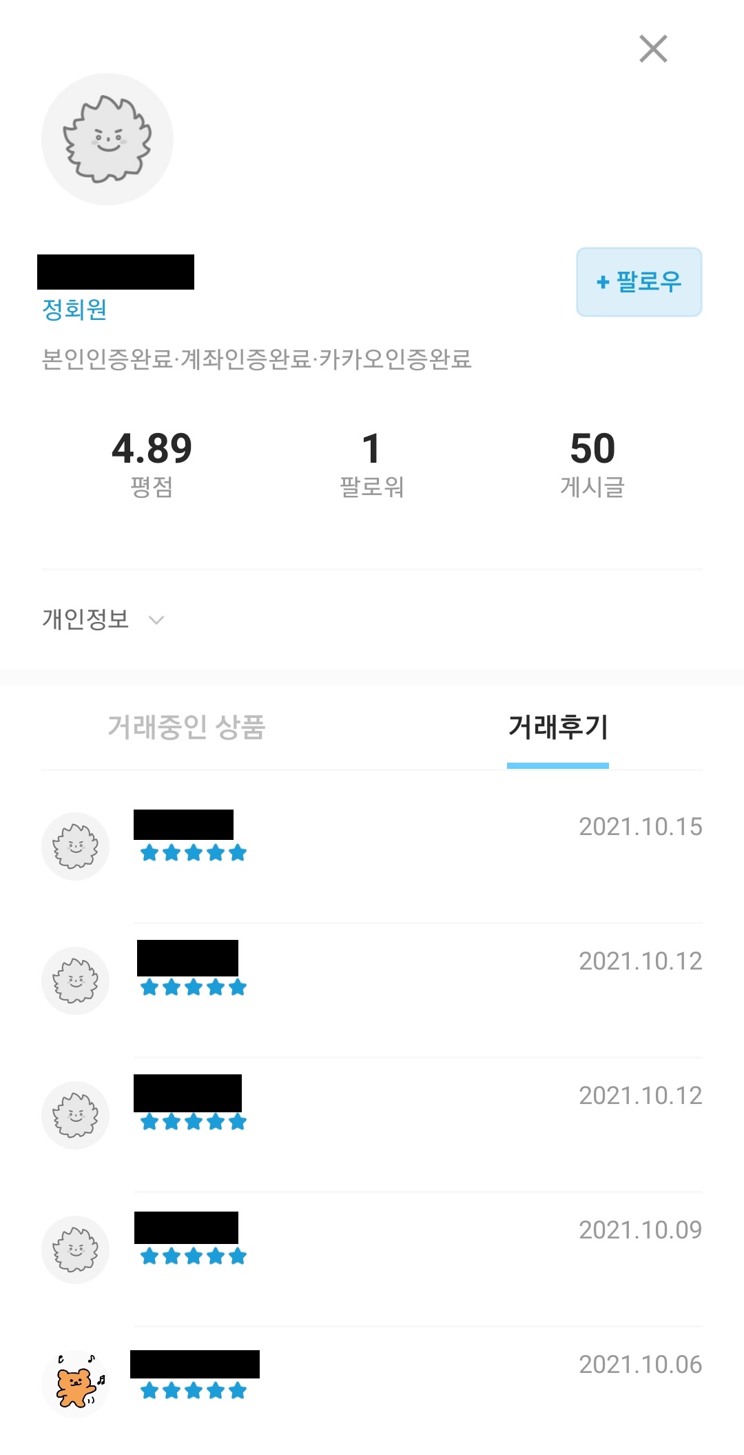 판매글 아래쪽을 보시면 판매자의 닉네임이 있습니다. 닉네임을 클릭하시면 오른쪽 사진 같이 거래 후기를 볼 수 있습니다. 판매자의 평점과 거래한 사람들의 후기를 보시고 안전하게 거래하시길 바랍니다.