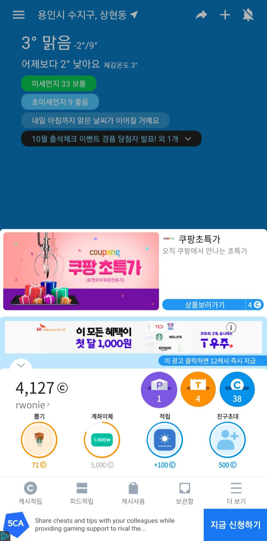 여기 하루 날씨는 캐시고 제가 하는 다른 앱테크에서는 1 캐시당 1원인 곳이 있는데