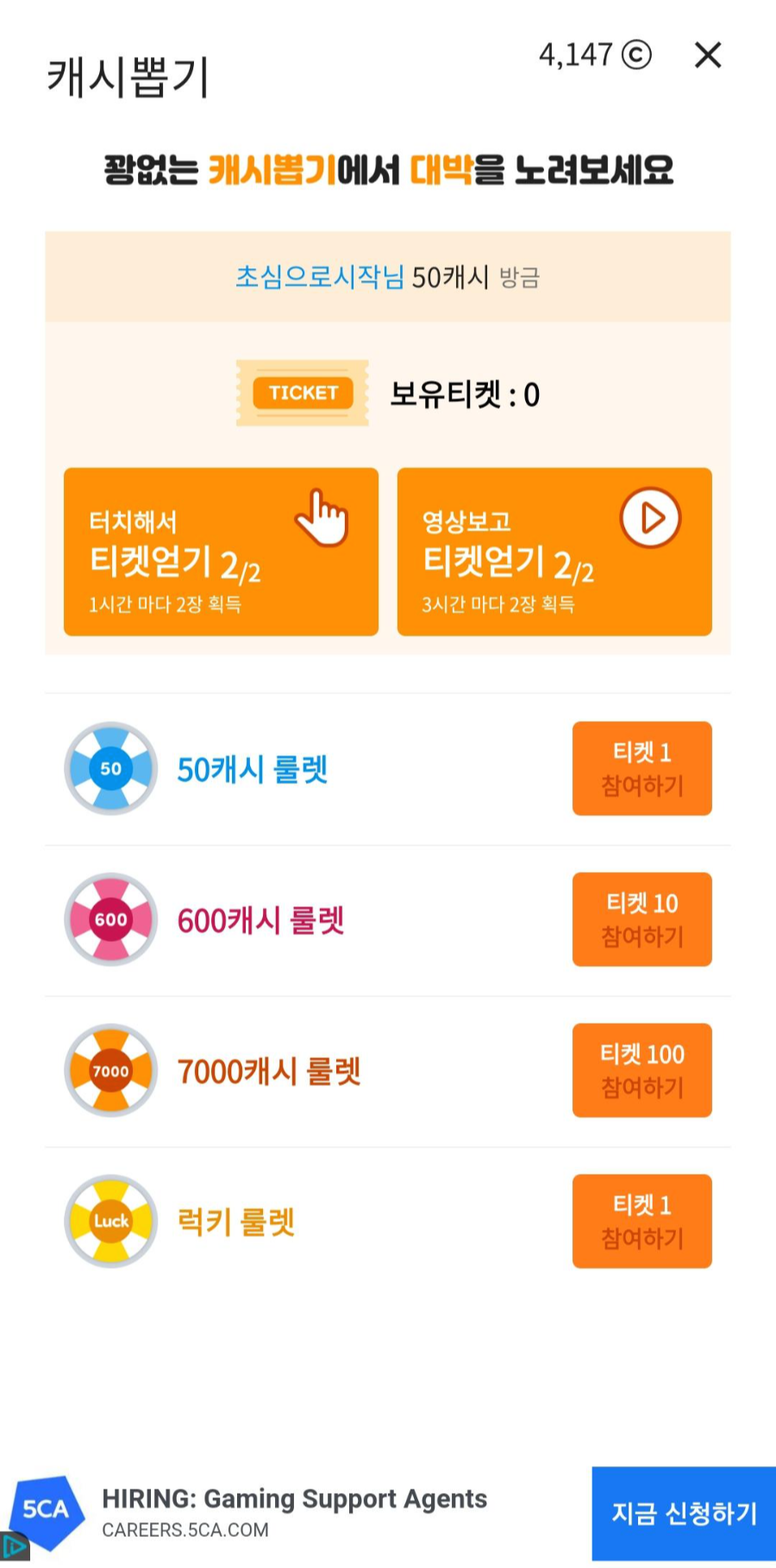 획득한 캐시는 룰렛을 돌리시면 됩니다. 티켓 수가 많을수록 혜택이 크겠죠?^^