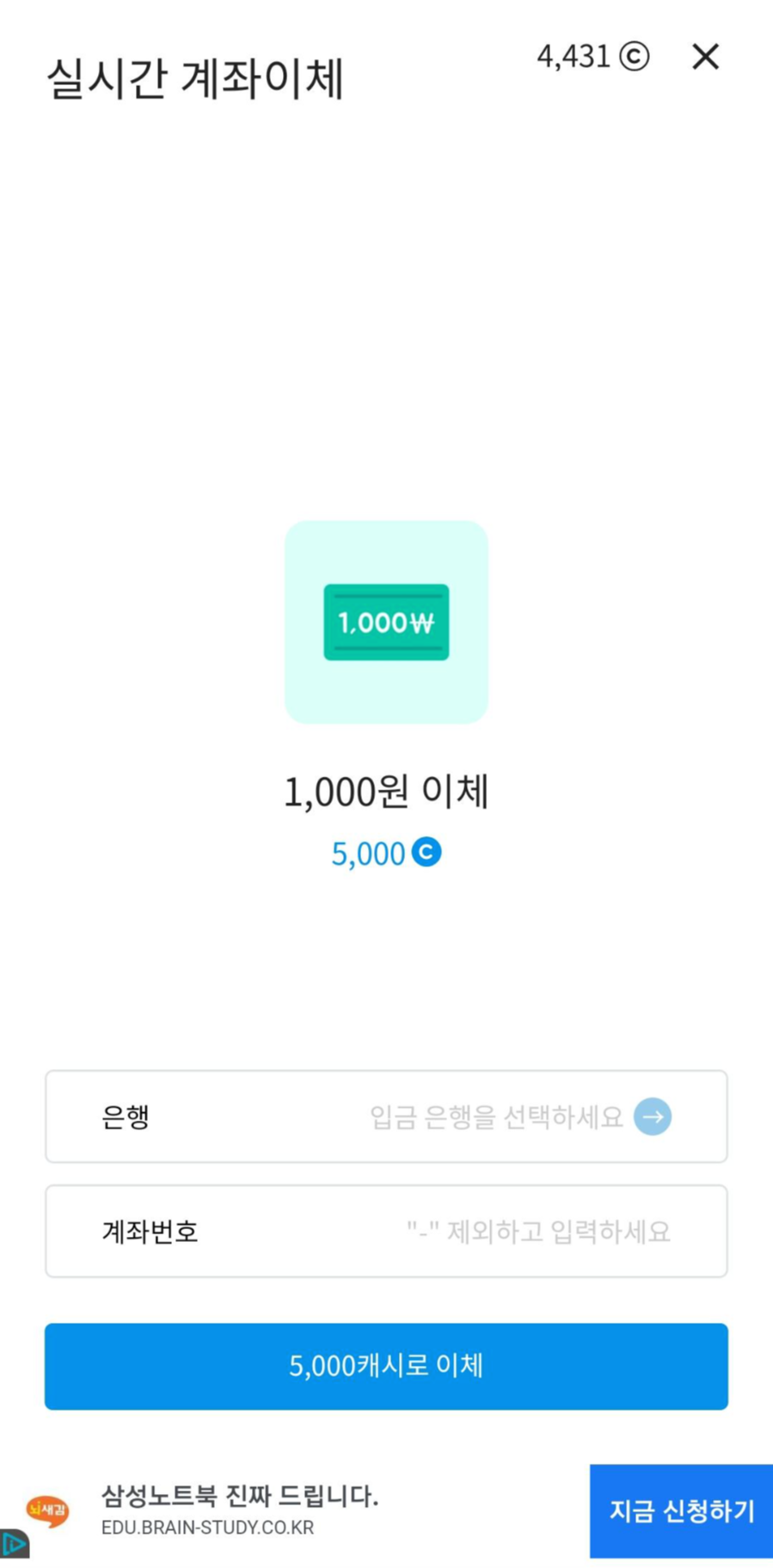 목표 캐시를 모으셨음 은행을 선택 후 계좌번호 입력하시면 계좌로 입금됩니다! ^^