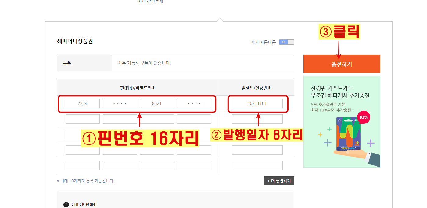 4. 상품권의 스크래치를 긁어 얻은 핀번호와 발행일자를 위 사진대로 입력한 후 충전하기를 클릭해주세요.