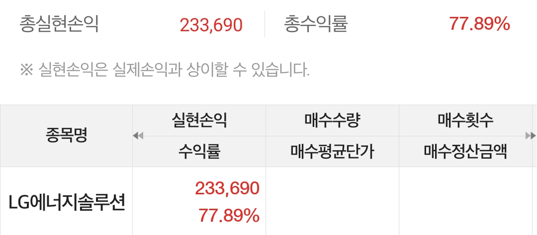 LG 에너지솔루션은 수익률 77.89%로 233,690원 수익 얻었습니다~