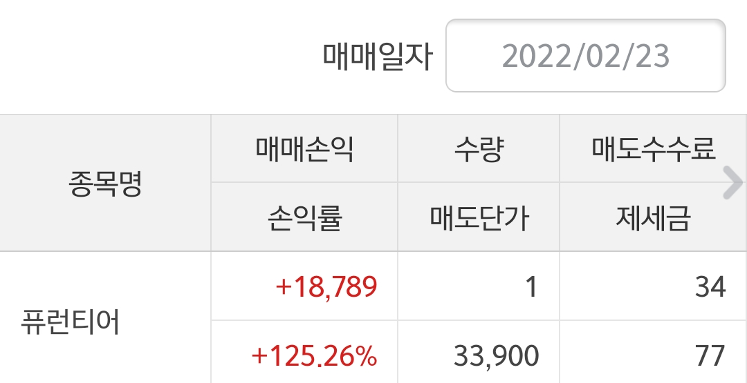 퓨런티어는 수익률 125.26%로 18789원 수익을 얻었습니다~
