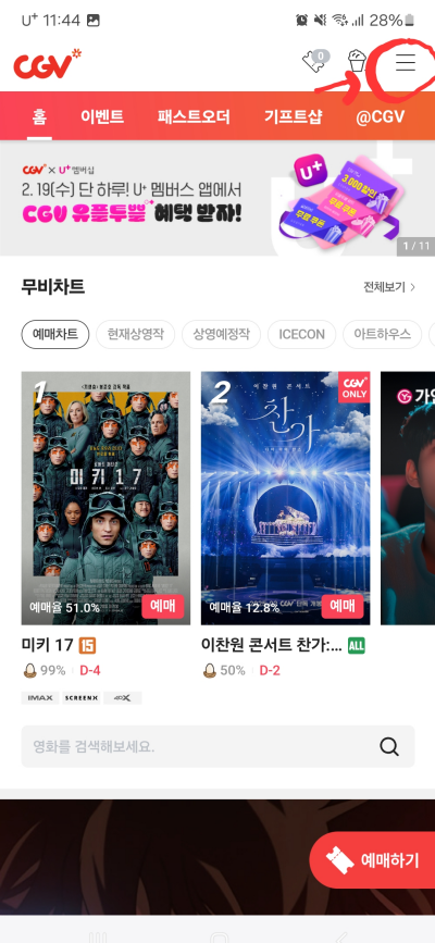 1. CGV 앱 홈 화면에서 오른쪽 상단의 메뉴를 클릭해 주세요.
