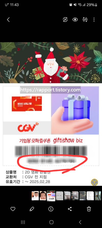 바코드 밑에 있는 번호가 CGV 할인쿠폰 번호입니다.