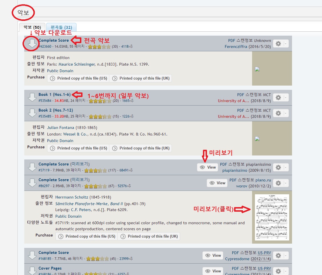 VIEW나 악보 그림을 클릭해 다운로드 전 상태가 좋은 악보를 미리 확인해 볼 수 있습니다.