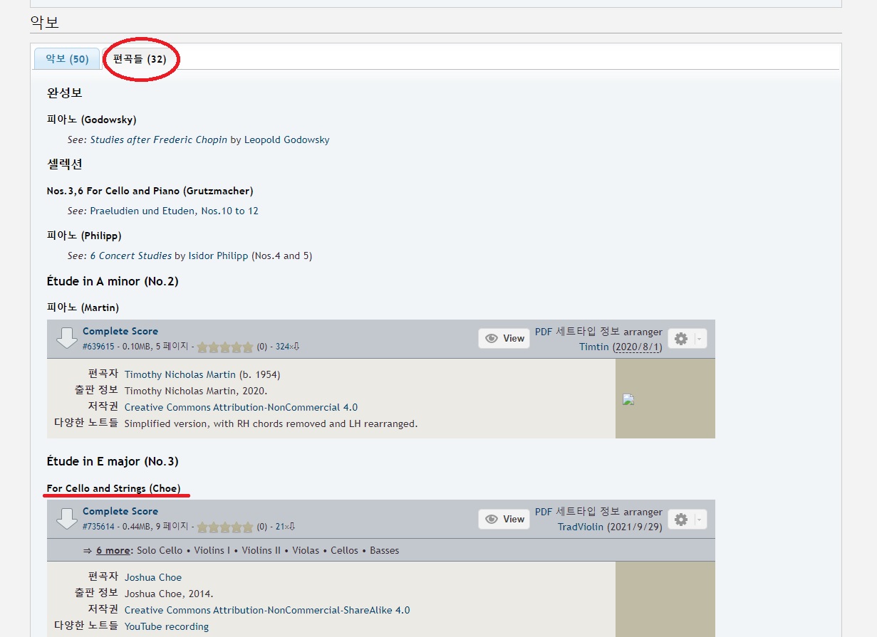 편곡을 누르면 같은 곡인데 다른 버전으로 편곡했거나, 악기 구성을 다르게 편곡한 악보들이 있습니다.