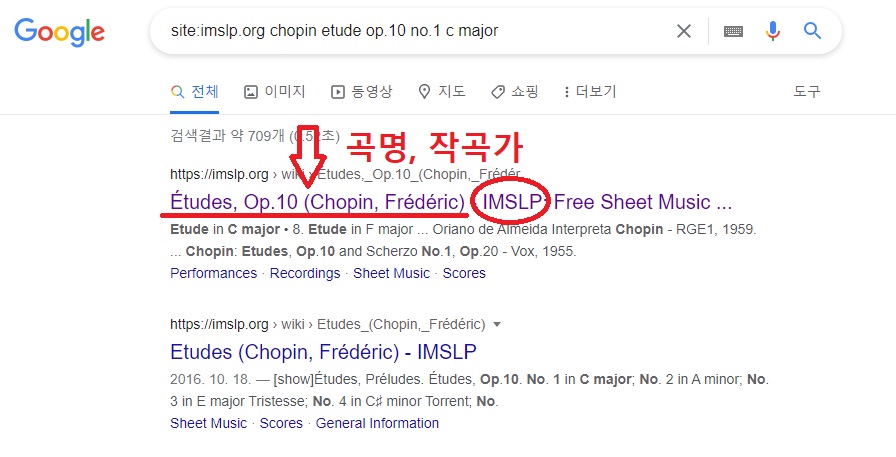 검색 결과 중 곡명, 작곡가를 확인하시고 IMSLP라 써진 검색 결과를 클릭합니다.