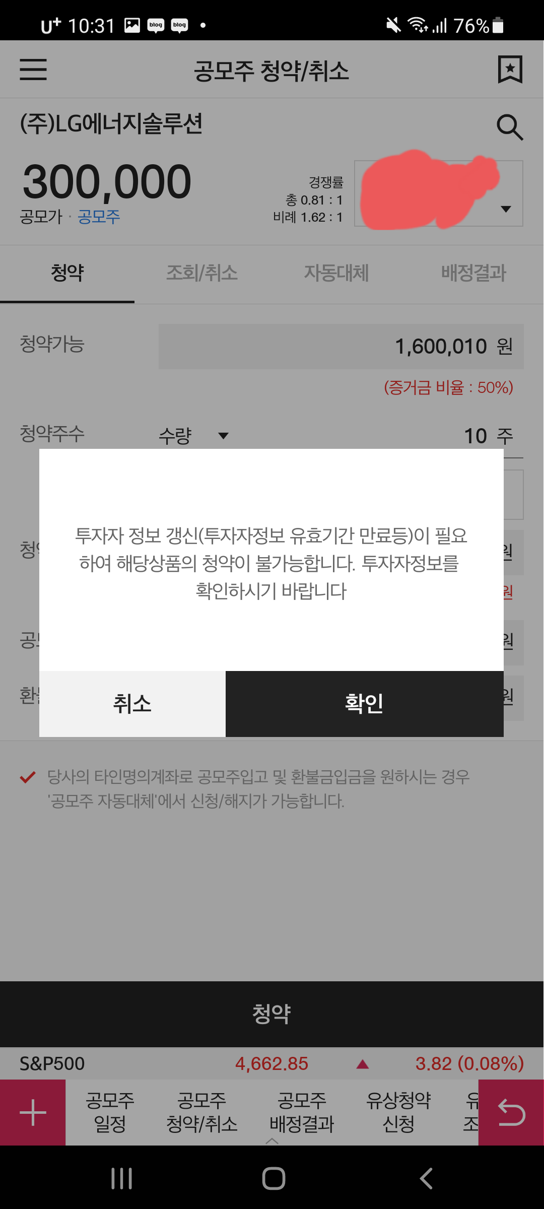 확인 누르면 투자자정보 갱신하는 화면이 나와야되는데 렉이 걸려서인지 화면이 뜨질않았어요ㅜㅜ