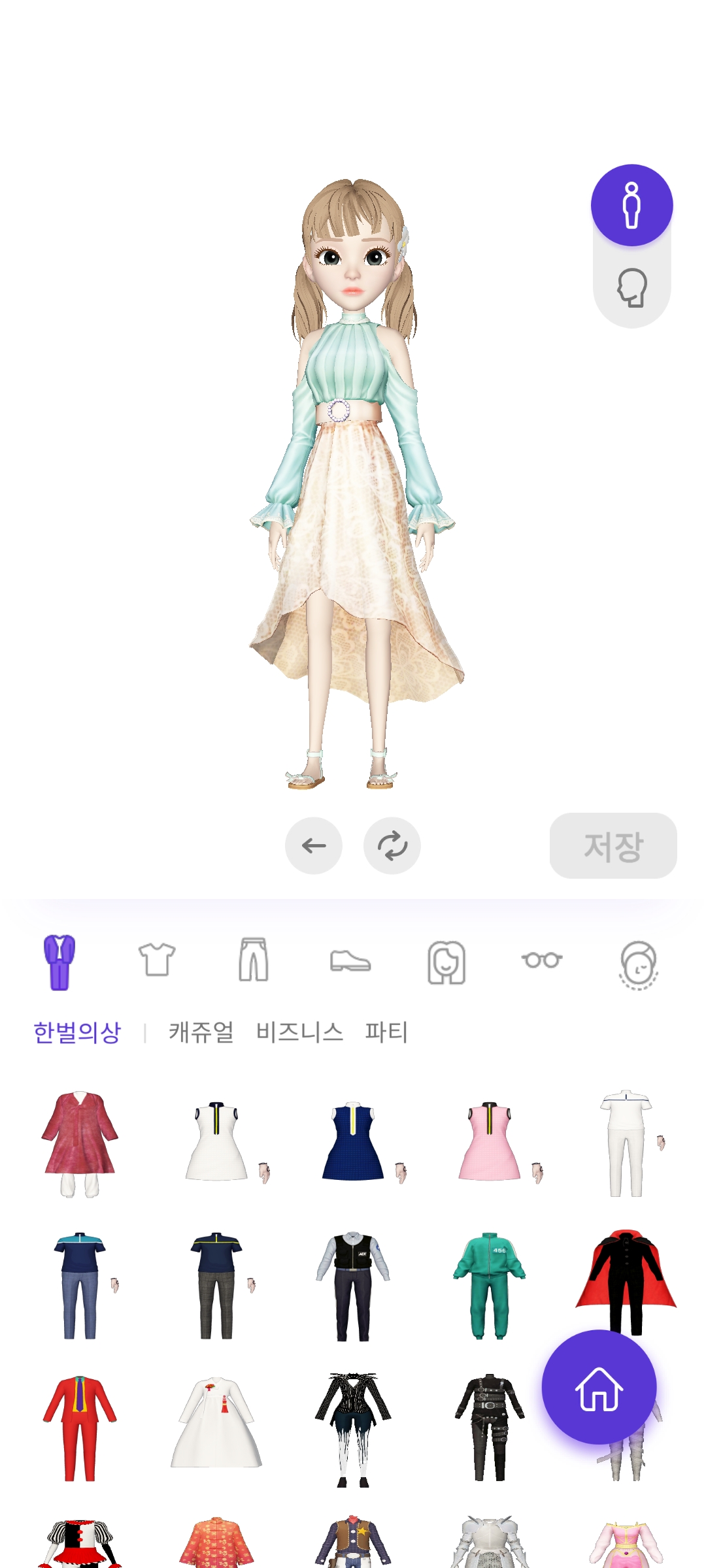 상의, 하의, 한벌, 안경, 헤어스타일, 머리카락 색깔 등등