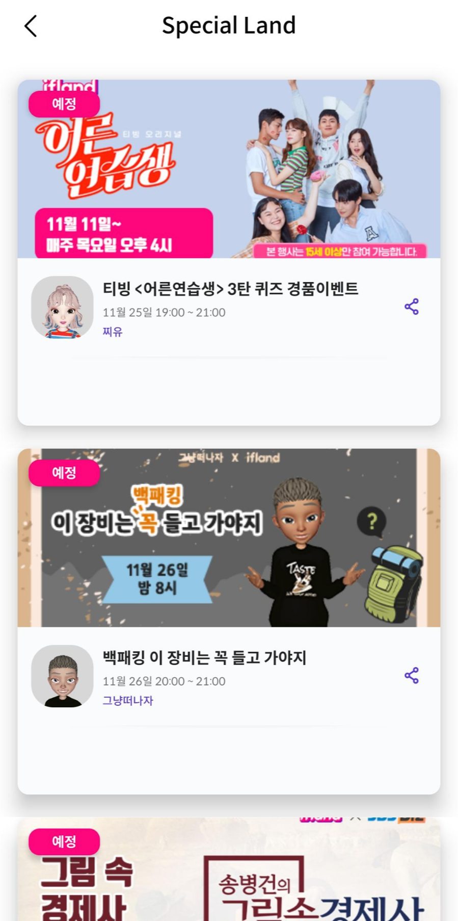 홈 화면 하단에 별 표시를 누르면 스페셜 랜드라고 행사나 강의 일정이 나와있어요.