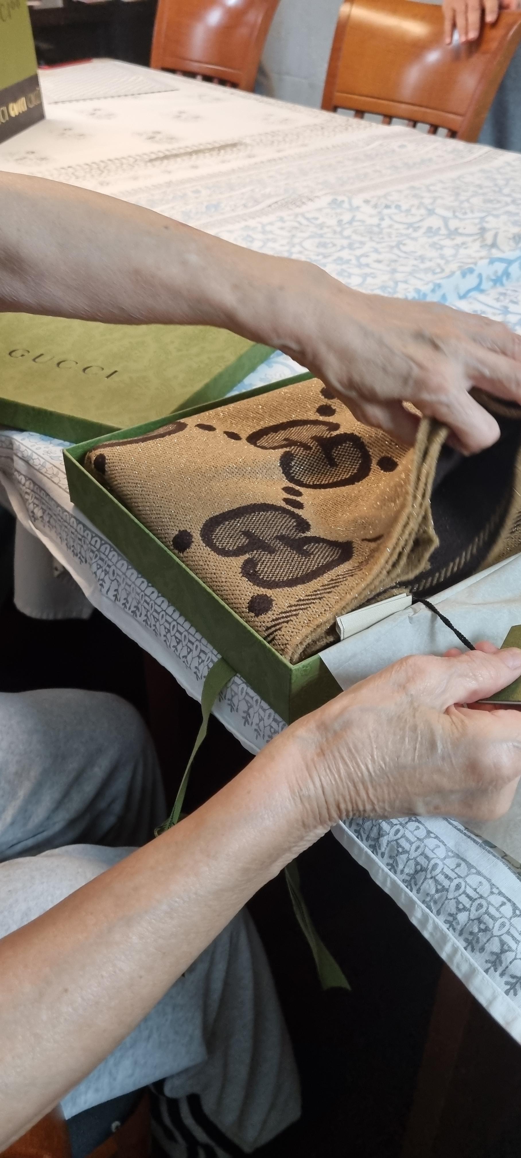 할머니 생신 선물로 이모가 구찌 스카프를 선물 주셨어요.