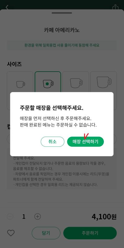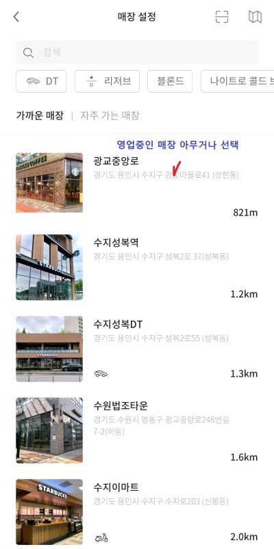 4. 음료 선택 후 매장을 선택합니다. 매장은 영업 중인 매장으로 아무 곳이나 클릭하셔도 상관없습니다.