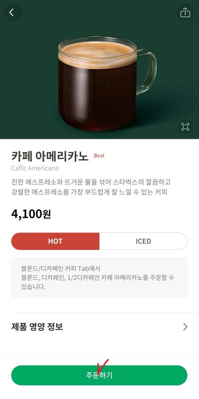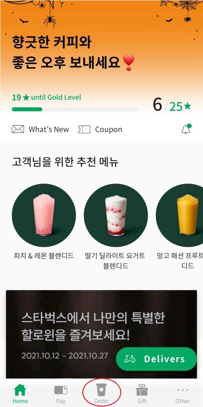 1. 스타벅스 어플에 들어가 하단에 Order를 클릭합니다.