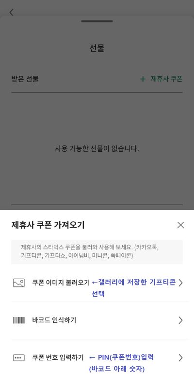 쿠폰 번호 입력하기는 바코드 아래 숫자를 입력하거나 쿠폰 번호만 주는 기프티콘의 숫자를 입력하시면 됩니다.